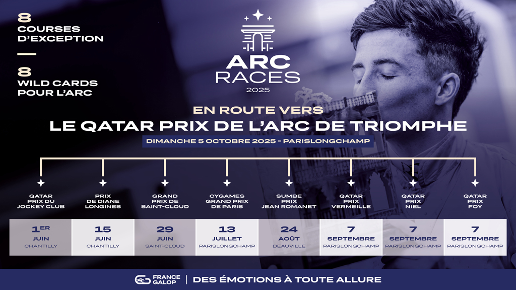 L’année 2025 marque le lancement des Arc Races : une sélection des plus belles courses françaises offrant aux vainqueurs un véritable sésame, une « Wild Card » pour le Qatar Prix de l’Arc de Triomphe, la course mythique du galop mondial dont la prochaine édition se tiendra à l’hippodrome ParisLongchamp le dimanche 5 octobre 2025.