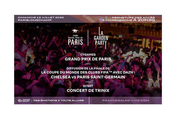Le dimanche 13 juillet 2025, vivez un programme original et unique en plein cœur du Bois de Boulogne : des courses réunissant les meilleurs jockeys et chevaux de galop, diffusion avec DAZN de la finale de la Coupe du Monde de la FIFA™ des Clubs pour vibrer, des DJ Sets en plein air pour danser, une ambiance d’épopée interstellaire et un food garden à ciel ouvert pour se restaurer et prendre un verre !