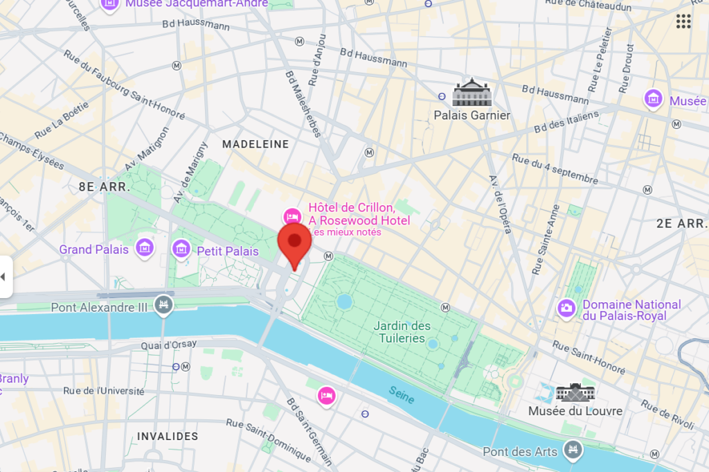 Métro : arrêt « Concorde », sur les lignes 1, 8 ou 12.